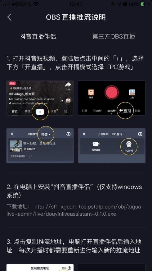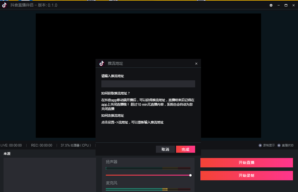 运用电脑进行抖音直播,安装抖音伴侣出现以下画面,填写入由抖音手机端直播中的游戏直播提供的RTMP的地址,即可使用抖音直播伴侣进行直播。