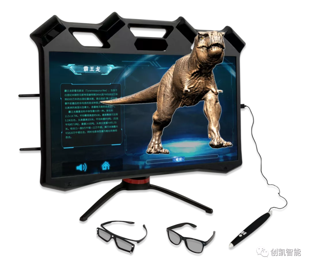 2、27英寸LCD高清1080p/60Hz一体机,带内置跟踪传感器,集成红外LED触控追踪操作笔,配置偏振无源眼镜;支持外置电脑3D信号输入;