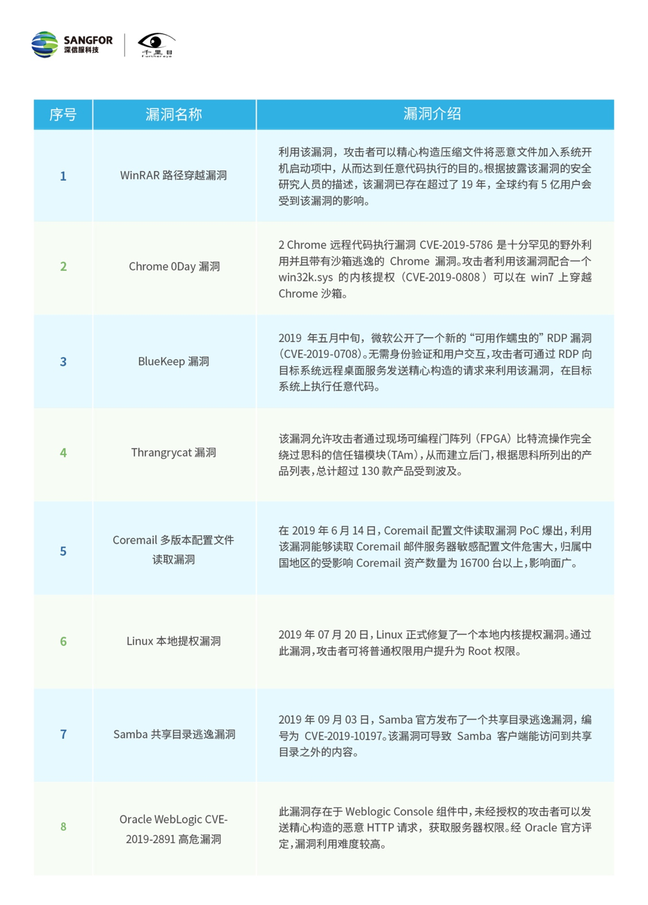 回顾2019年,漏洞利用攻击的网络安全事件高发,航空、医疗、保险、电信、酒店、零售等行业均受影响。漏洞利用的网络攻击次数在后半年有所缓减,但是仍有较多高危严重漏洞持续爆出,漏洞的不断挖掘、曝光和修复实际上可以很大程度提升系统的安全性,但如果不能及时修复,会失去攻防大战的先机,处于被动的地位。