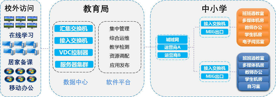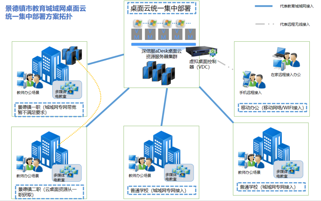 随着整个教育城域网升级改造工作的推进,景德镇市教育局利用先进的信息化技术,创新式地采用桌面云构建了“市教育局-下属中小学”的统一教学、办公云平台,实现教育资源集中部署、办公桌面统一运维、教学环境随时获取,从而提升全市中小学的整体教学质量和师生的信息化水平,进一步促进教育资源的均衡化发展。