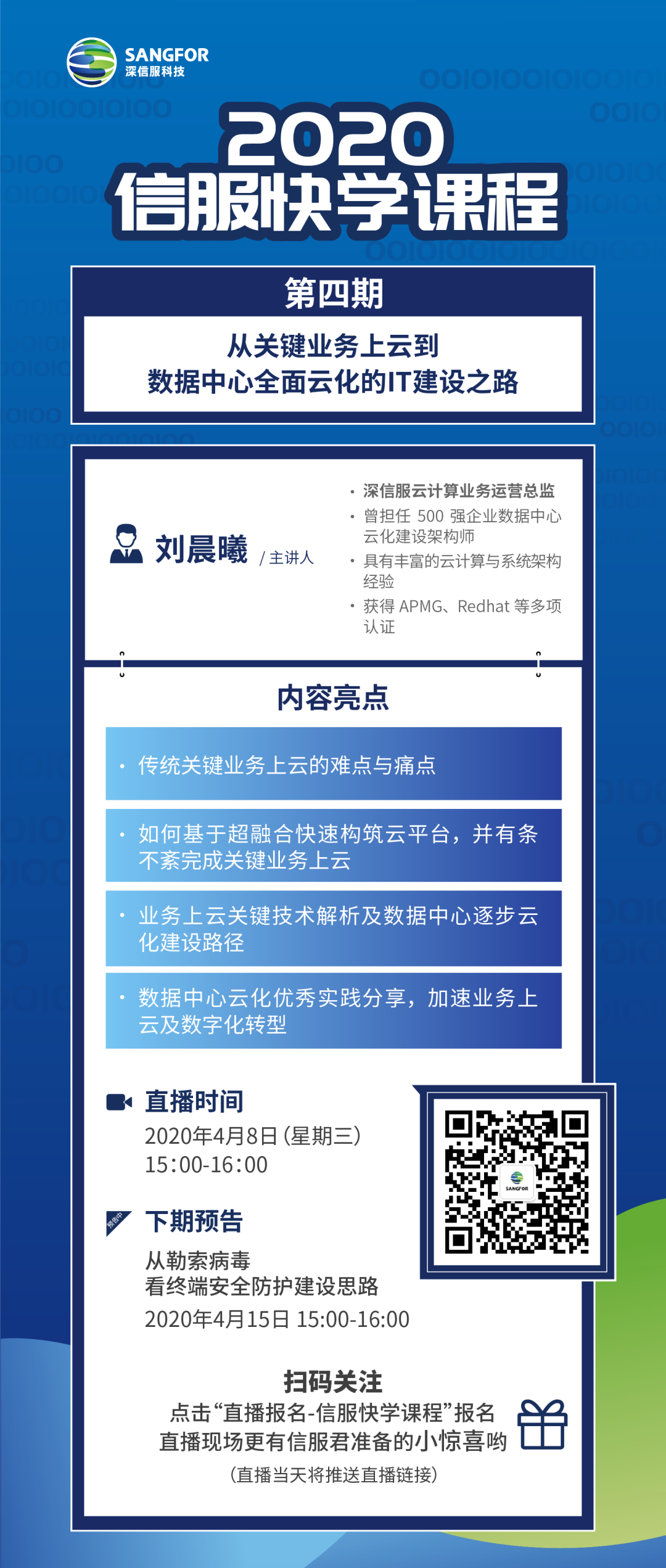 基于此,信服君本期将为您分享:企事业单位如何基于超融合快速构筑云平台完成关键业务上云?业务上云关键技术是什么?如何保障数据中心云化后的可用性、一致性、高性能、扩展性?最后,课程也会分享部分企事业单位用户业务上云实践案例,以及进行云计算在线环境操作演示,带您了解业务上云及数字化转型的实际落地思路与效果。
