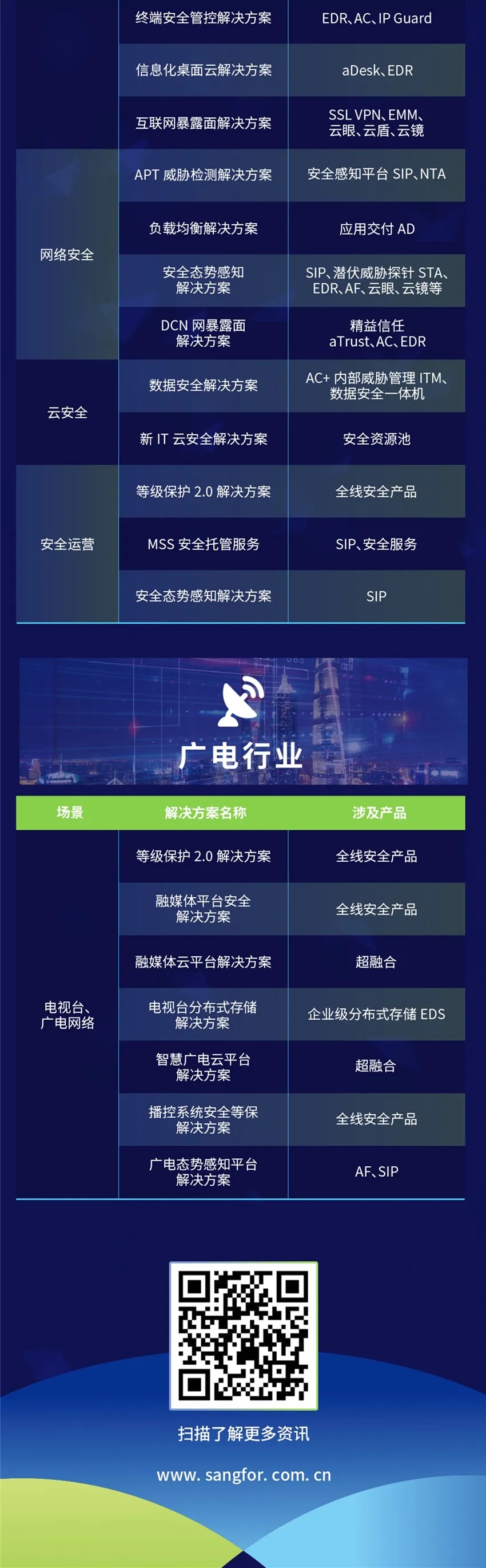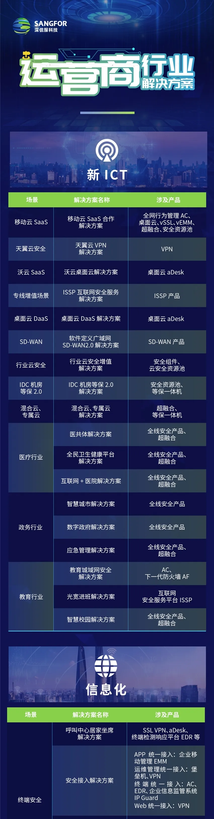 以下为深信服当前面向运营商ICT、信息化和广电行业三个方向的多场景解决方案概览图: