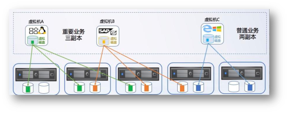 随着用户业务场景的增多,不同用户在不同的业务场景下对于存储业务也有着差异化的需求。比如重要业务虚拟机需要更多的副本数与更高性能的Qos策略(来获取更高级别的数据安全与性能),而普通业务虚拟机则不需要。那么如何在同一个存储池中满足用户不同的存储需求?