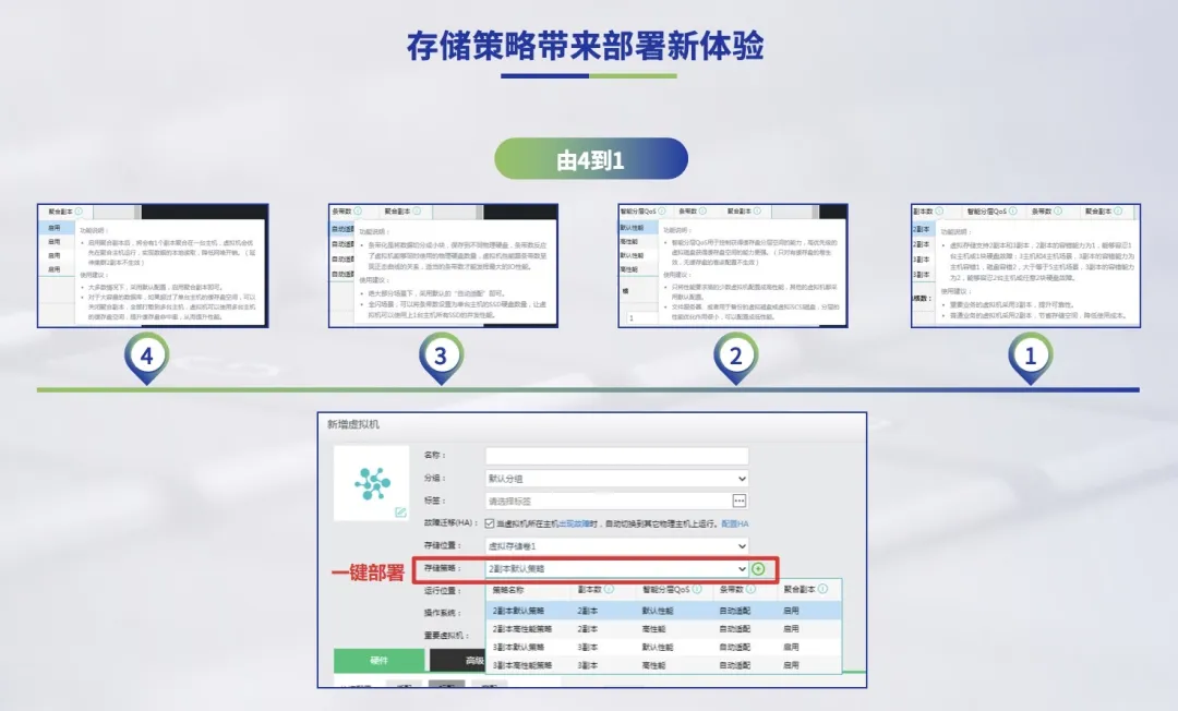 • 更易部署:aSAN内置常用存储策略,同时也支持用户自定义存储策略。在部署新虚拟机时,由四步设置变为一键选择,简化操作流程,节省用户部署虚拟机时间,也减少人为失误导致虚拟机参数错误。