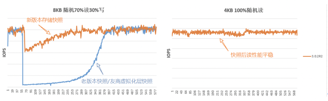 • 写性能影响大幅减少:快照在存储层实现,相比计算虚拟化层面打快照后写性能下降幅度减少60%,读性能几乎零影响。