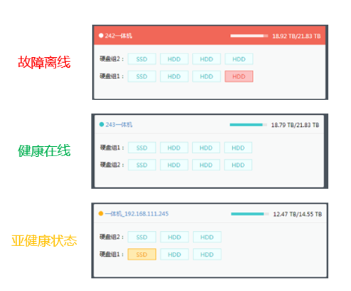 超融合6.0检测出的亚健康磁盘在前端主机硬盘列表界面呈现为黄色,将故障离线磁盘呈现为红色,健康磁盘呈现为绿色。三种颜色直观清晰的体现硬盘三种不同的状态,方便用户及时发现集群中的亚健康硬盘与故障硬盘并采取相应保护措施,确保数据安全。