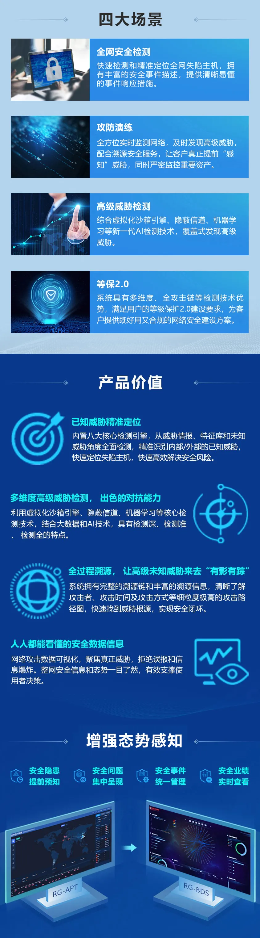 系统通过八大核心检测引擎、综合威胁情报、行为模型、机器学习、虚拟化沙箱和安全特征库等检测技术深度发现高级未知威胁,提供检测-关联-溯源-统计分析的一站式安全解决方案,让用户彻底摆脱面临高级威胁攻击时无法提前预知、无法精准定位、无法完整溯源的窘境,提供可预见、可定位、可溯源的完整对策,助力企业构筑更安全、更值得信赖的网络环境。