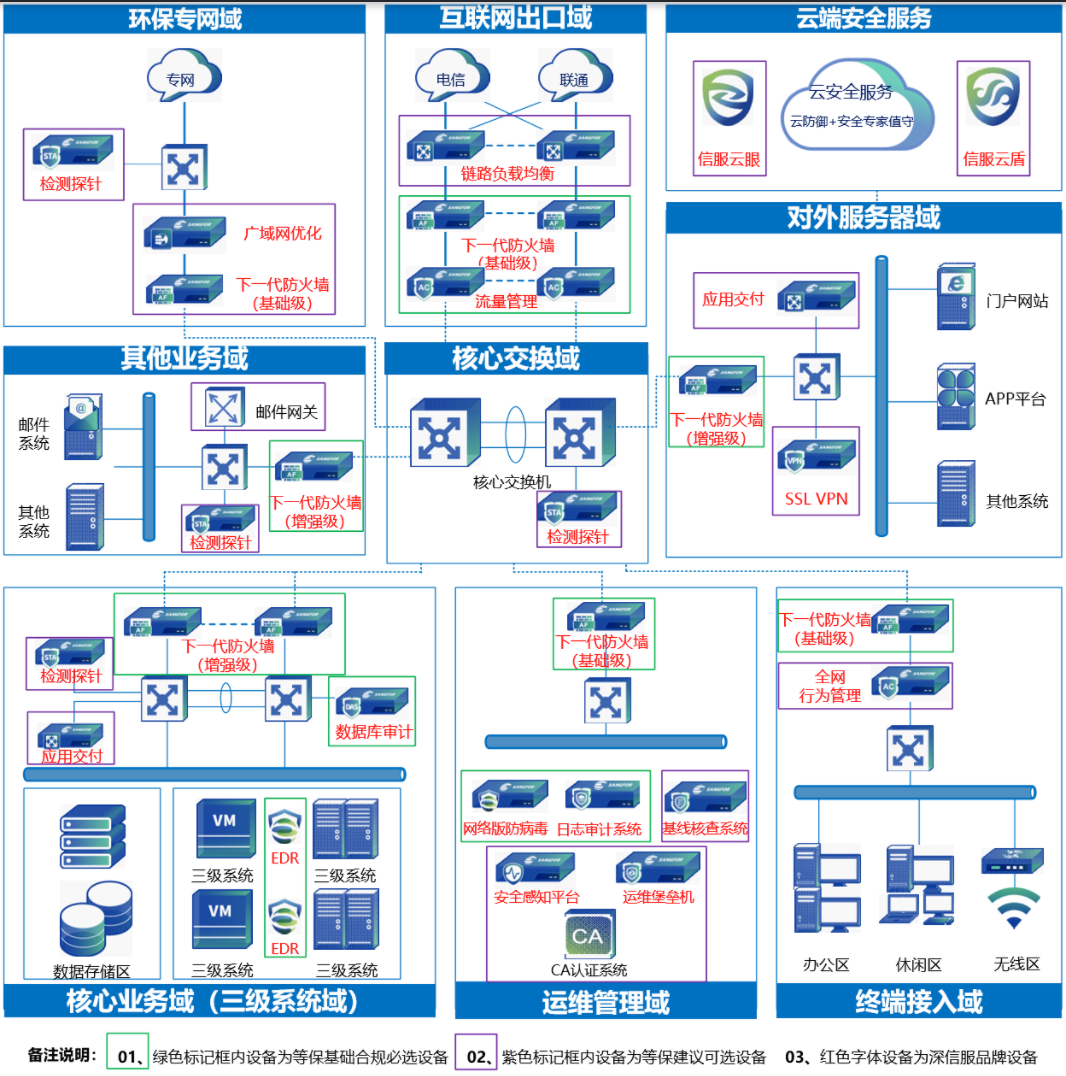 以高性价比(设备数量少)方式优先解决等保主要不合规项或测评权重较高要求项,基本满足通过测评要求,构建基本的安全防护体系。