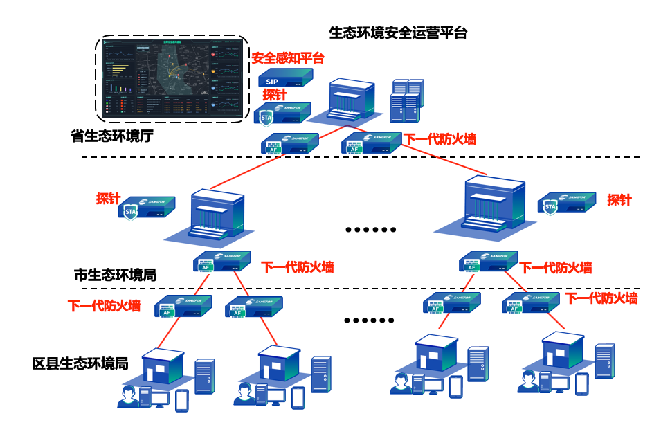• 在省、地市、区县、乡镇部署深信服下一代防火墙AF实现针对专网边界的安全防护。