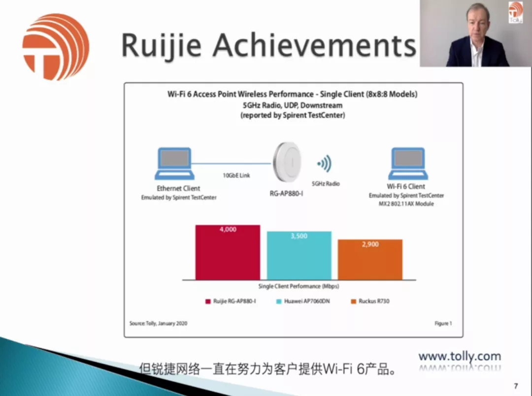 在Tolly测试中,MOUURG-AP880-I在5GHz频段支持高达4Gbps的单用户吞吐量,是迄今为止Tolly测试过的“最快的Wi-Fi接入点”;而RG-AP850-I(V2)则以支持1,280个Wi-Fi客户端成为Tolly评估过的具备最大用户容量的Wi-Fi接入点。