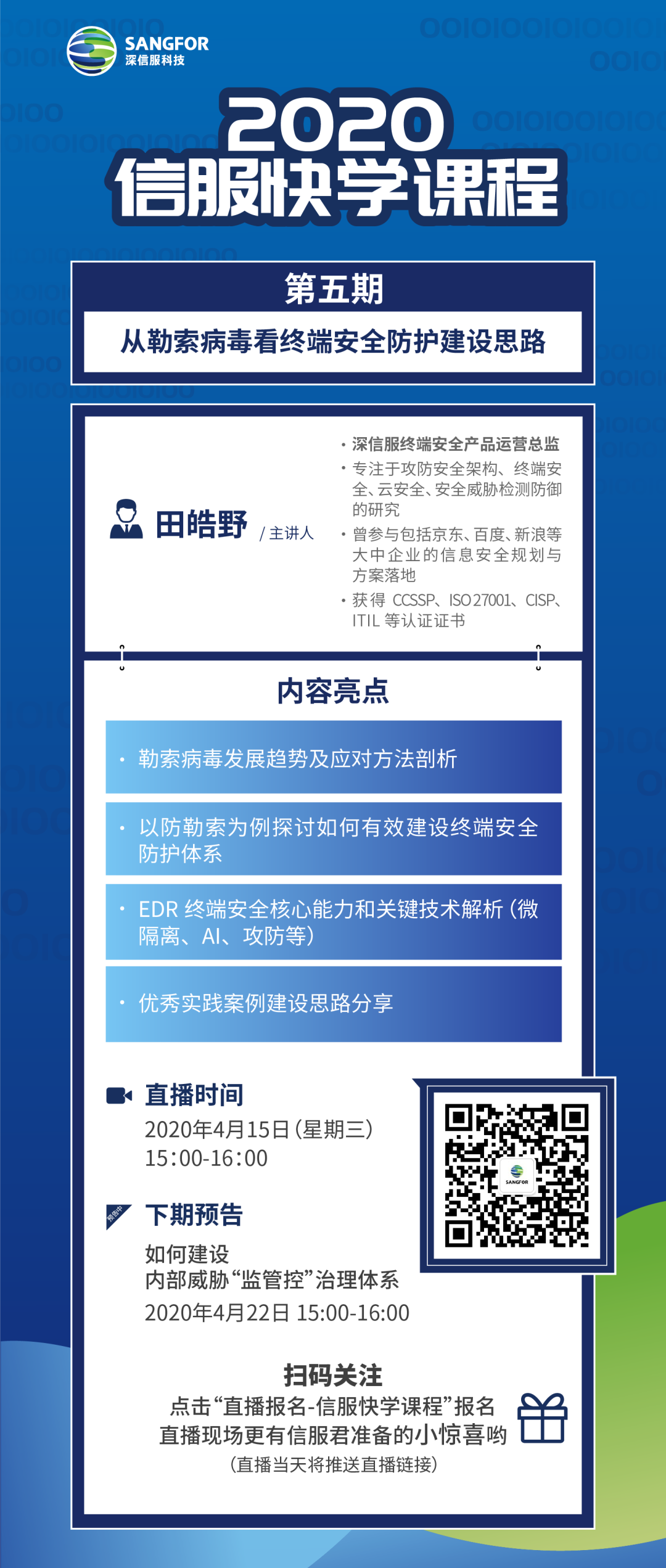 信服快学课程第五期,深信服将从勒索病毒发展趋势及应对方法讲起,以防勒索为例与您探讨如何有效构建终端安全防护体系,带您了解当前热门的终端检测响应平台EDR如何通过预防、防御、检测、响应四阶段安全闭环保护终端安全,当然还有当下优秀的实践案例帮助您了解终端安全防护体系的实际落地思路与效果。