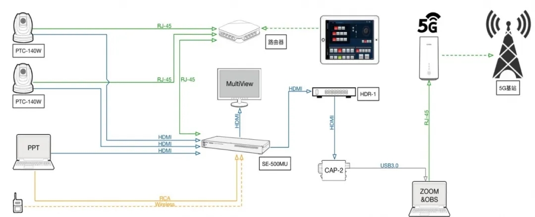 再次,将HDR-1录制信号输入到洋铭的HDMI信号采集盒CAP-2当中,进行信号采集,进入会议互动或者是一些直播软件,最后实现网络播出。