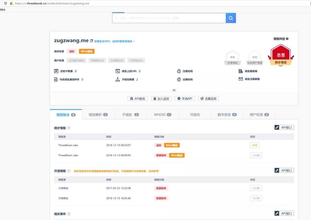 一些第三方威胁情报公共平台可以进行黑域名的协助确认(以下截图以微步在线威胁情报社区为例):