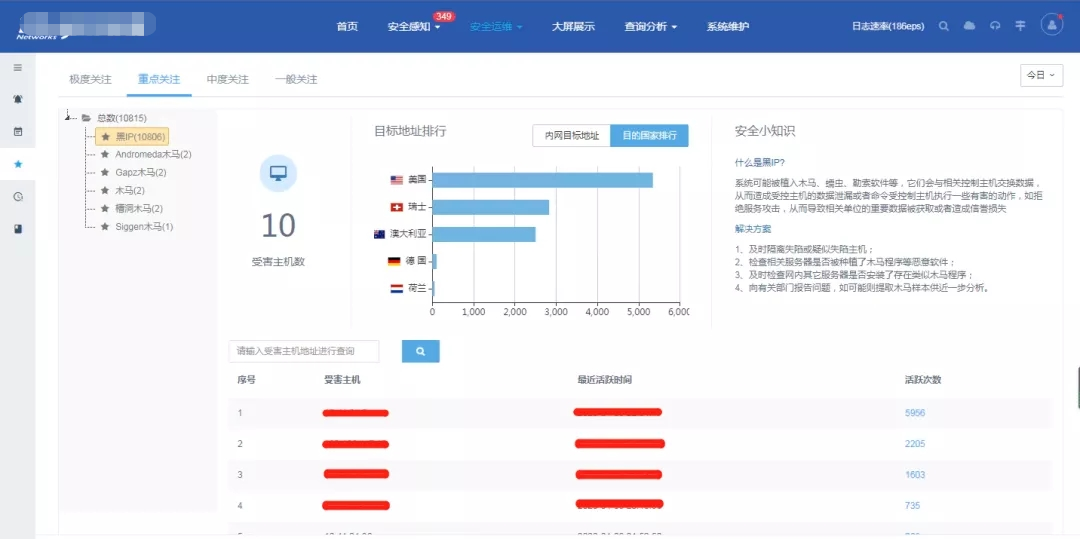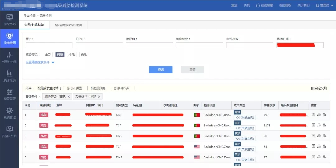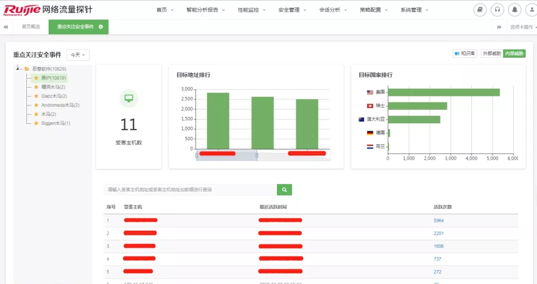 同时借助于我司RG-BDS大数据安全平台、RG-BDS-TSP流量探针以及RG-APT高级威胁检测系统,均能第一时刻发现黑域名的解析与访问,并进行告警。