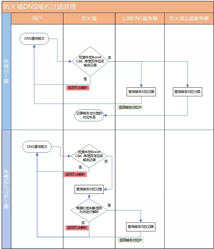 3.在缓存信息有效的前提下,第二次以及更多次请求识别到域名A的解析请求时防火墙可以直接进行处理;