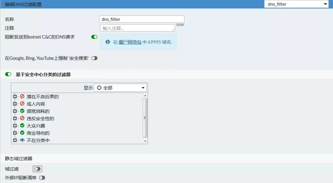 静态域过滤器-外部IP阻断清单:与域过滤类似,可手工定义一组IP列表,当域名解析出的地址在该地址列表范围内,人为指定处理动作;