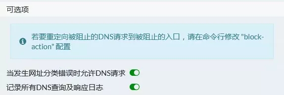 推荐必须开启的功能选项:阻断发送到BotnetC&C的DNS请求,基于安全中心分类的过滤器(务必根据实际需要对特定分类的动作进行修改与确认),可选项-当发生网址分类错误时允许DNS请求。