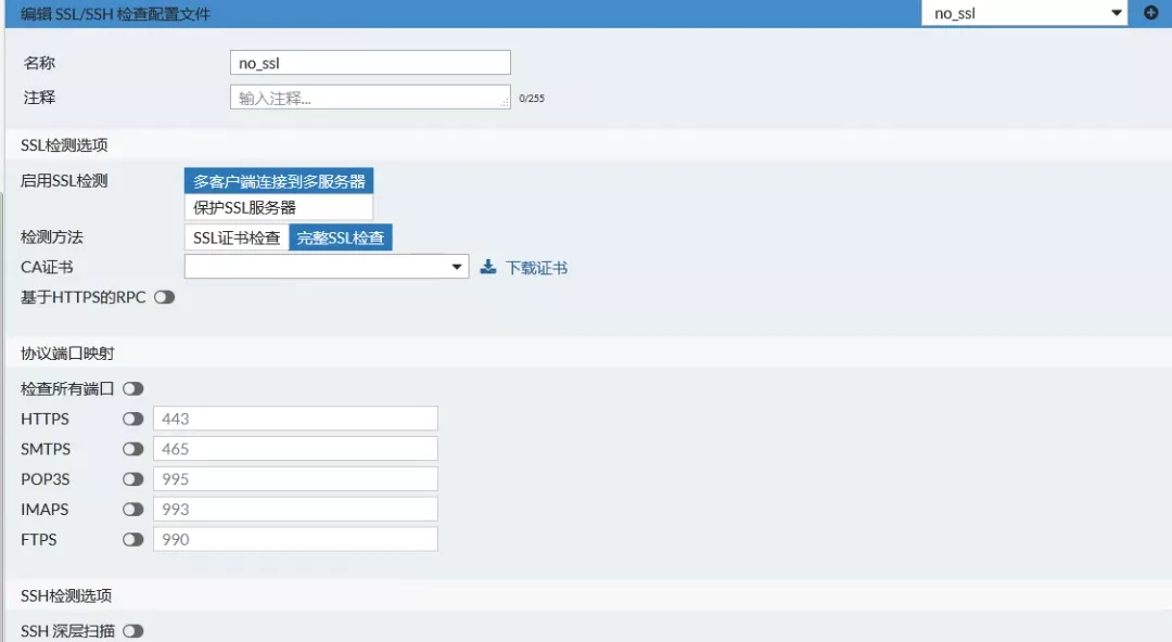 配置方法:通过WEB方式进入 对象配置--SSL/SSH深度检测模板,点击右上角新建按钮,创建一个新的SSL/SSH深度检测模板,如下图新建的SSL/SSH深度检测模板“no_ssl”: