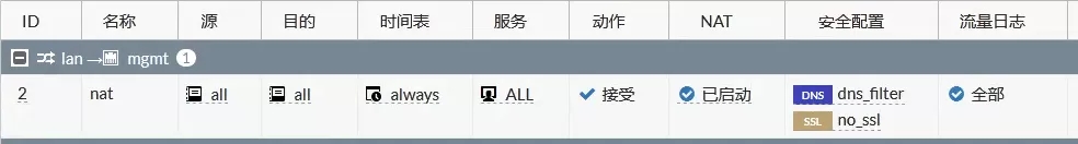 通过Web界面,在策略设置--IPv4策略中,对现有策略进行调整。如下图所示,在对上网上网的“安全配置”进行设置后,调用DNS过滤模板“dns_filter”以及SSL/SSH深度检测模板“no_ssl”:
