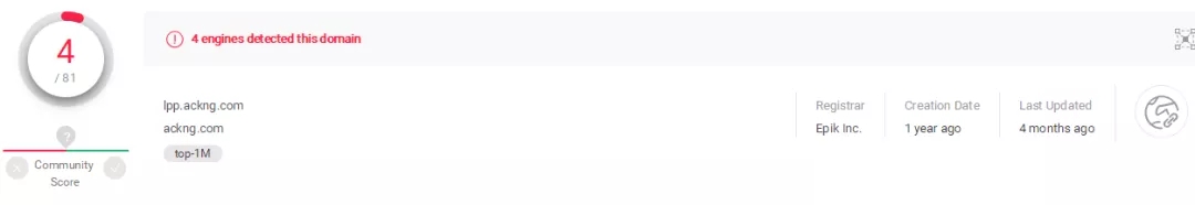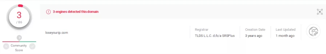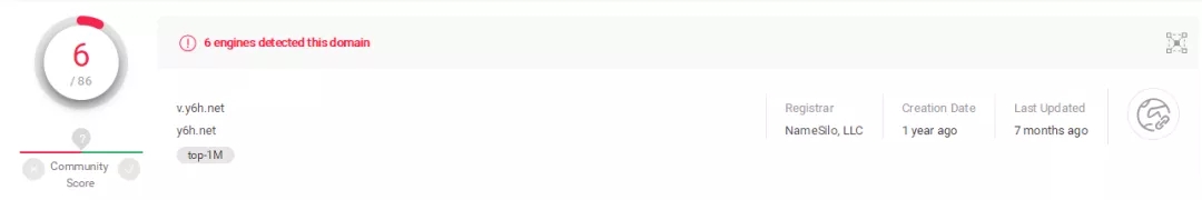 1、本案例中使用“v.y6h.net” “lpp.ackng.com” “loseyourip.com” 3个黑域名进行测试,(以下是使用VirusTotal工具验证所测试的3个域名风险性截图,确认属于高风险域名):