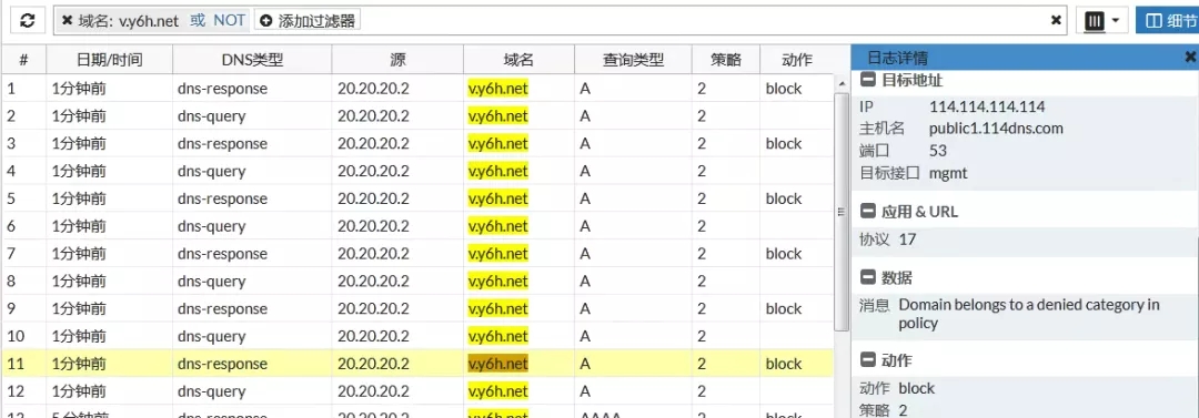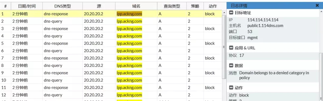a)动作为“block”且消息字段显示“Domain belongs to a denied category in policy”,表明该DNS报文是通过DNS分类手段被阻断;