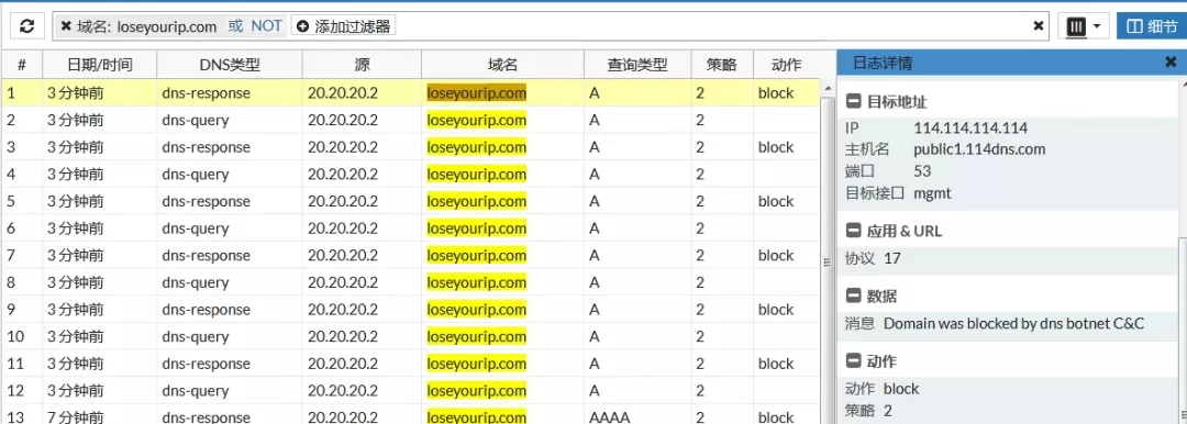 b) 动作为“block”且消息字段显示“Domain was blocked by dns botnet C&C”表明该DNS报文是匹配到本地的Botnet C&C库被阻断;