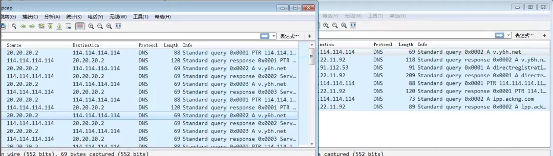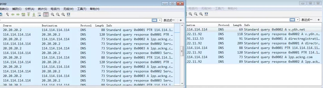 (截图左侧为防火墙内网口报文,右侧有防火墙外网口报文)