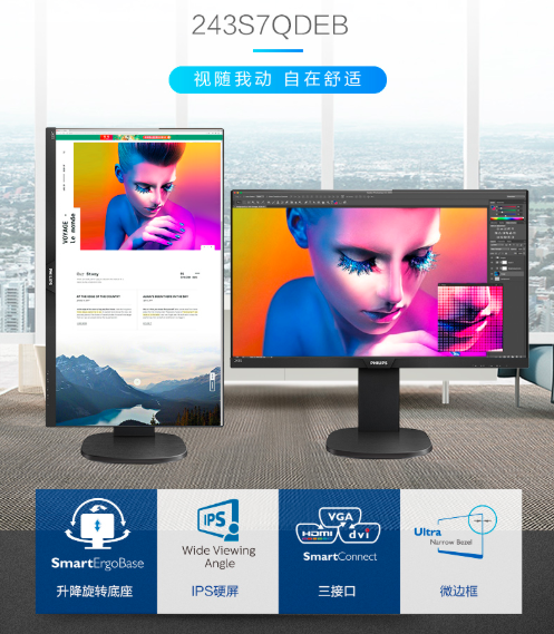 243S7QDEB和273S7QDEB都搭载了人体工学底座,高低升降、左右旋转、垂直旋转、角度倾斜样样精通,让你随心摆弄,根据自身需要将屏幕调整至舒适的坐姿状态,避免肩颈酸痛,从而让良好的工作状态维持得更长久。