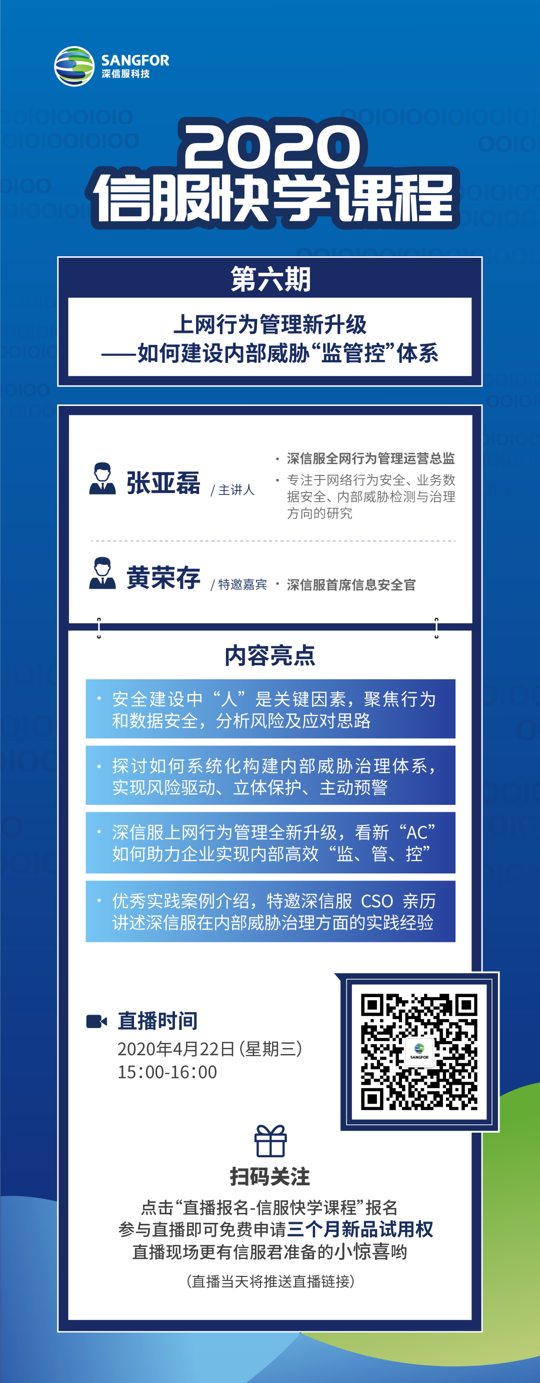 本期直播,我们特别邀请到深信服首席信息安全官出席,聚焦常见的内部人员行为和数据风险等内部威胁,探讨如何建设内部威胁治理体系,做到管好人、控好行为、监控好内部风险的“监管控”体系。