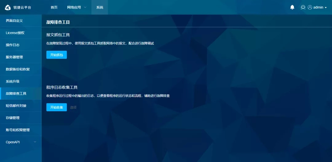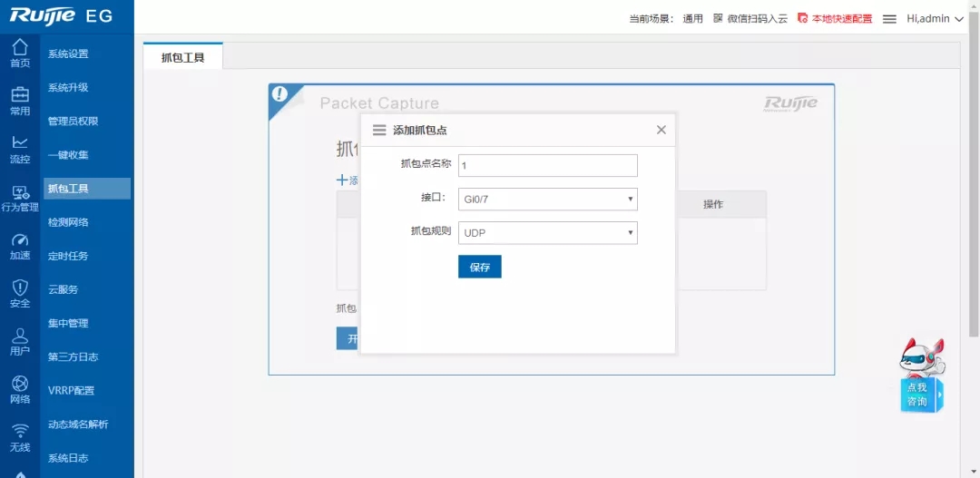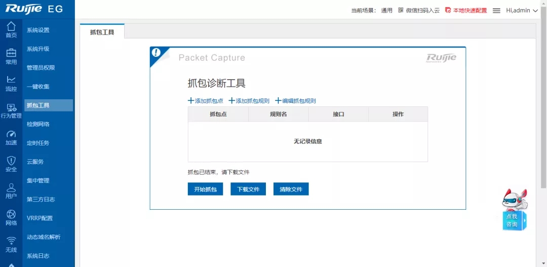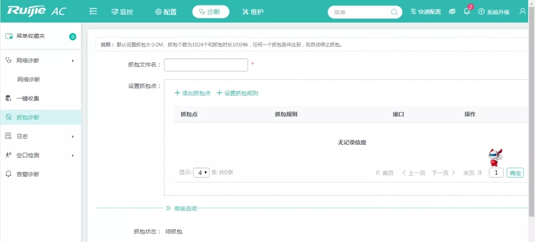 (1)在EG的WEB页面点击“高级-抓包工具”打开“抓包诊断工具”(老版本EG点击“高级-一键收集-抓包诊断工具”)