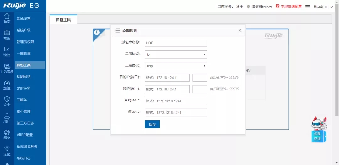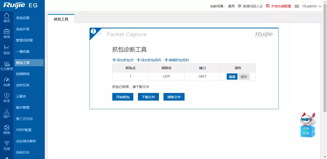 出口网关(以下简称“EG”)是通过PCAP功能实现抓包,可以在命令行下或者WEB页面下进行报文捕获。EG命令行下配置PCAP参考上节数据中心交换机PCAP控制面抓包配置此处不在赘述。在EG的WEB页面下进行报文捕获是比较常用的方法,操作方法如下。