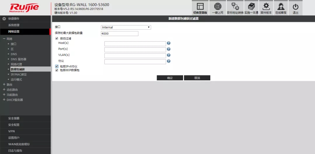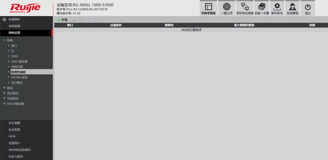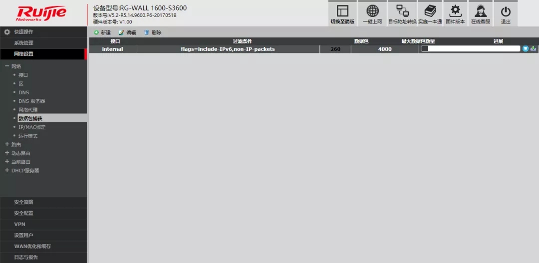 (1)在防火墙的WEB界面点击“网络设置-网络”打开“数据包捕获”