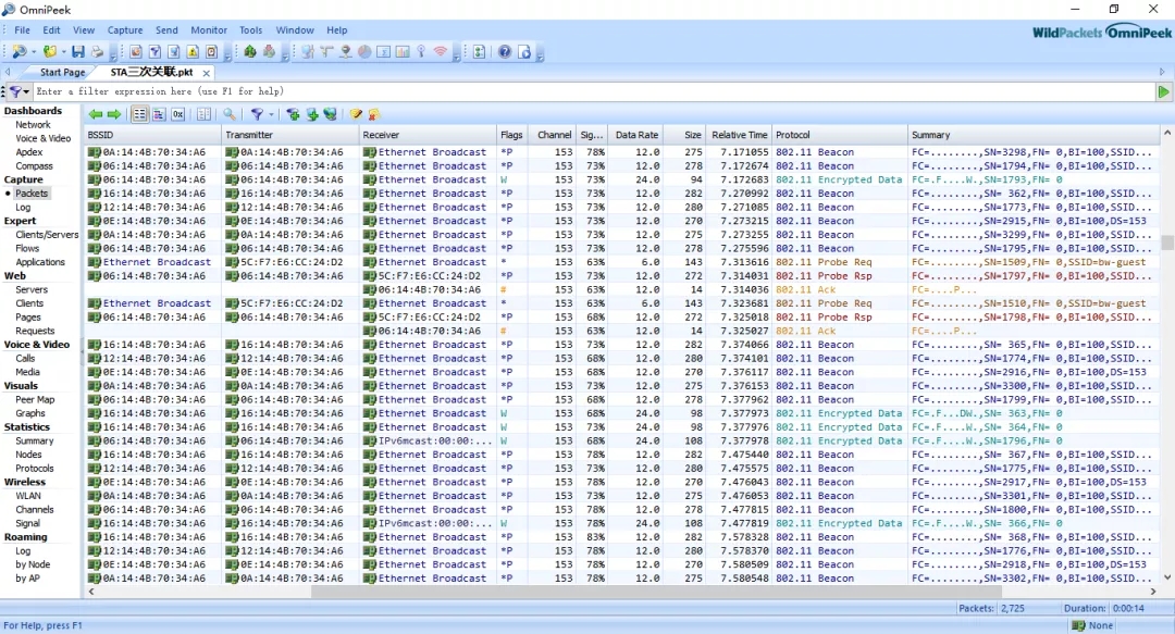 使用Omnipeek进行无线空口抓包是目前最常用的方法,需要注意的是Omnipeek只支持部分无线网卡捕获无线空口报文,支持的无线网卡型号可在Omnipeek官网上查询,同时还需要安装特殊的无线网卡驱动才可以捕获到无线空口报文。
