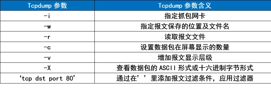 MCP可以通过Linux服务器上的Tcpdump工具进行抓包,可以在命令行下和WEB页面下进行报文捕获。如果说Wireshark是世界上最流行的图形化数据包分析工具,那么Tcpdump是世界上最流行的命令行数据包分析工具。通过SSH登录到MCP的Linux服务器上使用Tcpdump命令进行抓包,使用Tcpdump抓包后可以直接在命令行下进行分析或者将报文导出使用Wireshark进行分析,下表为大家整理了常用的Tcpdump命令参数。
