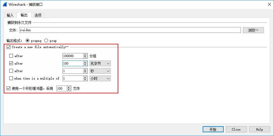 在SMP/SAM+的Windows服务器上使用Wireshark进行报文捕获时,推荐将Wireshark设置成分片抓包的方式进行抓包,在捕获选项页面中选择输出选项,作者的习惯是每捕获100MB保存一个报文,一共保存100个报文,循环覆盖保存,这样设置后最多占用硬盘10G的存储空间,不必担心报文过多将硬盘占满,读者可根据自身的实际情况设置。这样设置后开启抓包,故障再出现时就不用担心抓不到故障报文了。
