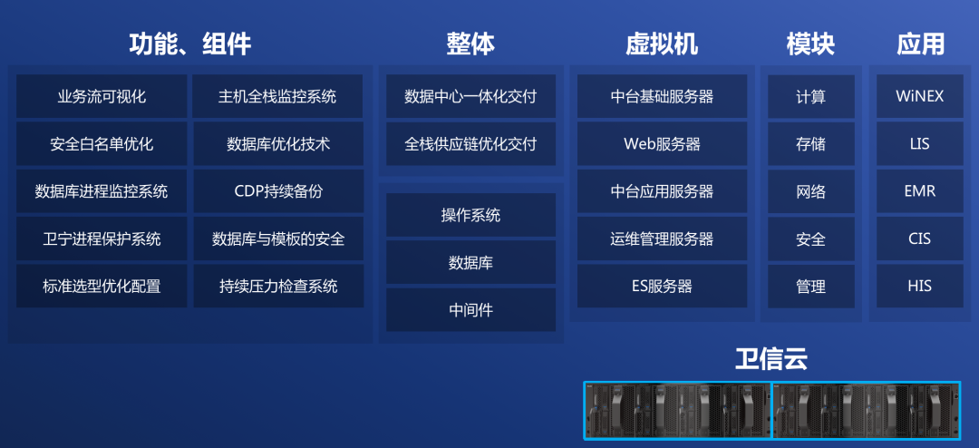升级版的软硬件一体化解决方案卫信云(以下简称“卫信云”)主要围绕卫宁健康新一代软件WiNEX进行优化设计,可以让用户高效地“开箱即用”卫宁健康业务系统。基于卫宁软件的开发功能细节,从功能组件上看,卫信云保留了上一代卫宁软件优秀的产品功能,包括业务流可视化、以及最核心的数据库优化,并通过对数据库底层、操作系统底层、软件底层等多维度进行测试与调整,使WiNEX 能够更好地匹配和承载运行用户业务,保障用户的使用体验。