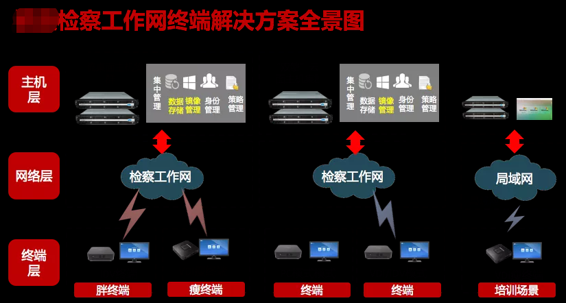 在统一业务应用系统2.0建设中,终端是实现应用落地的基础,也是关系到应用体验的核心,是必不可少且极为重要的部分。随着云桌面技术的成熟,替代传统PC的云桌面已经逐渐应用到智慧检务办公环境中。该技术借助于桌面虚拟化技术手段,将PC的桌面运行环境搭建于虚拟化系统之上,管理员可以通过集中搭建的管理平台,轻松实现办公终端的统一管理与运维。MOUU网络已经在贵州、内蒙、山西、辽宁等众多省市检察院大规模部署云桌面,承载统一业务应用系统2.0,为智慧检务建设贡献力量。