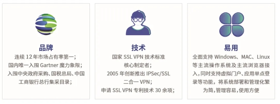 深信服SSL VPN集SSL/IPSec于一身,可以高效的帮助中小企业构建端到端的安全防护体系,业内拥有多项加密技术,多种认证方式、主从绑定等特色功能,保证远程系统接入的用户身份安全、终端和数据安全、传输安全、应用权限安全和审计安全,具有快速、易用、全面等优势特点。SSL VPN自2008年起连续十二年在虚拟专网市场占有率第一(数据来源于IDC),一直走在技术前沿,提供优质服务,用户认可度非常高。