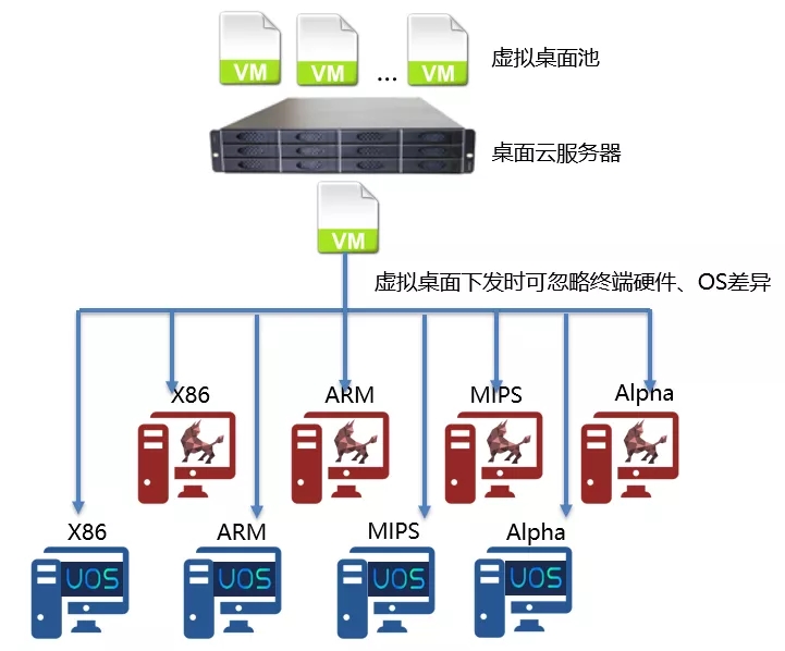 兼容性的定义是指,在共享相同的硬件或软件环境的条件下,产品、系统或组件能够与其他产品、系统或组件交换信息,和/或执行其所需的功能的程度。说直白些就是同一套软件或外设在不同架构的硬件或操作系统之下,功能和性能能否达到100%发挥,可用性、可稳护性和安全性能否保持一致水平。从长远发展来看,解决兼容性问题有更深远的意义,因为国内CPU芯片有X86、ARM、MIPS、Alpha多种架构,再来分别适配统信的UOS和麒麟OS两种操作系统,就会产生8种组合,再去适配众多的应用软件和外设简直是一项非常艰巨的任务。那是否能找出更为简单解决兼容性问题的方法呢?答案是肯定的,采用桌面云是一种有效的方式。