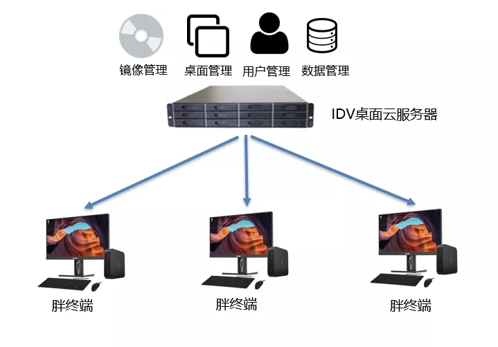 IDV架构是一种分布式计算、集中管理的架构。服务器上生成虚拟桌面镜像,通过网络将镜像推送至终端运行,在终端节点上完成虚拟桌面的程序计算和数据存储,同时把数据上传到云端同步保存。在服务器端可实现桌面镜像、用户、策略和数据的集中管理。跟VDI相比,把在服务器上的hypervisor层移植到了IDV胖终端上实现,在终端上实现了将操作系统与硬件的抽象分离。同时通过运用GPU和外设透传等技术,各种外设识别也不再需要通过桌面协议重定向到服务器上去解决,其优势一是大大简化外设与终端适配的工作量,其二是IDV胖终端的运行不再强依赖于网络和桌面协议,这样的特性使IDV方案更适合运用在业务实时性要求高、外设众多、断网可用的政务窗口、医疗工作站等场景上。