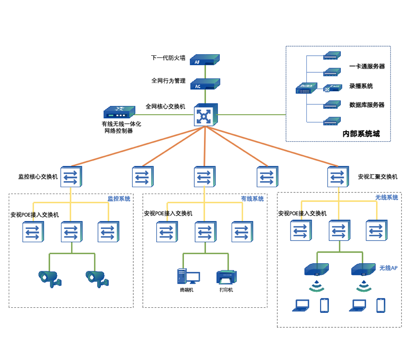 在学校网络互联网区部署深信服下一代防火墙、全网行为管理,核心业务区部署10插槽核心交换机,办公区接入安视交换机和高速无线AP。全校信息化建设按照“一盘棋”的思路进行整体设计、统筹推进、统一基础设施部署、一体化网络安全运行,避免单独应用或基础设施重复建设,设计方案充分贴合网络应用现状和未来发展趋势。