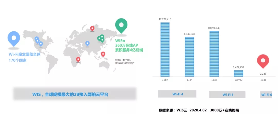 全球规模最大的2B接入网络云平台—WIS智能服务平台的数据显示,仅4月2日一天,在线终端3,000多万,其中Wi-Fi 6终端仅有2,200多,更老的Wi-Fi 4终端仍然存量较大。可以预见,Wi-Fi 6在大面积普及之前,将长期与大量低速终端共存。