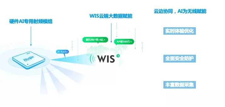 • AI Radio实时监测接入终端的射频特性、类型、无线应用,结合无线射频环境中的丢包、时延、速率等因素,同步到WIS云平台形成数字化输入。