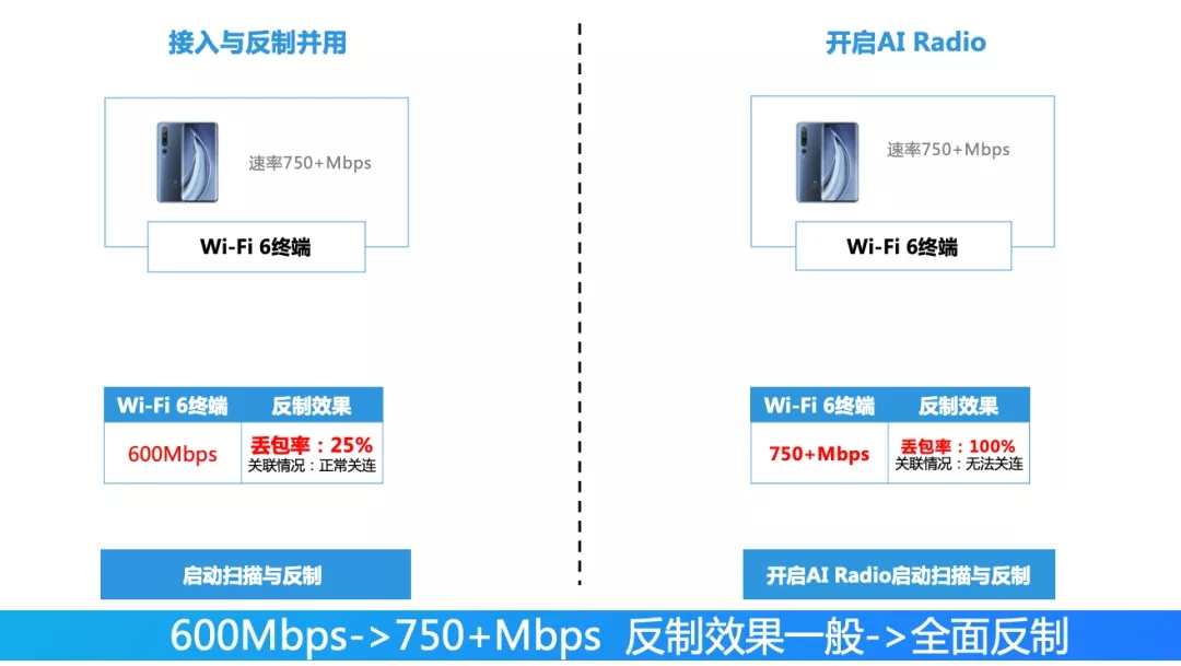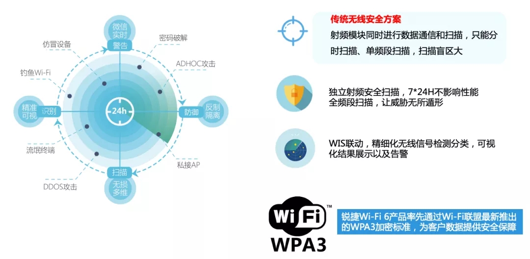 对于钓鱼Wi-Fi、非法终端等引发的空口射频安全风险,传统无线安全方案采用射频模块同时进行数据通信和扫描,只能分时、单频段扫描,扫描盲区大且无法有效反制,更重要的是影响到正常接入体验,可以说是杀敌一千自损八百。