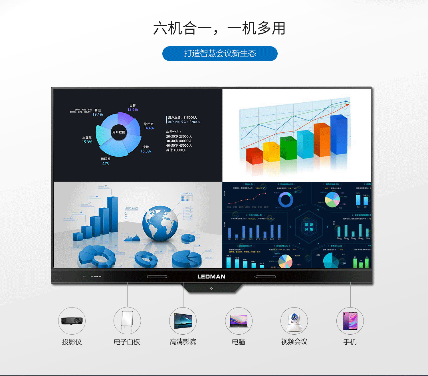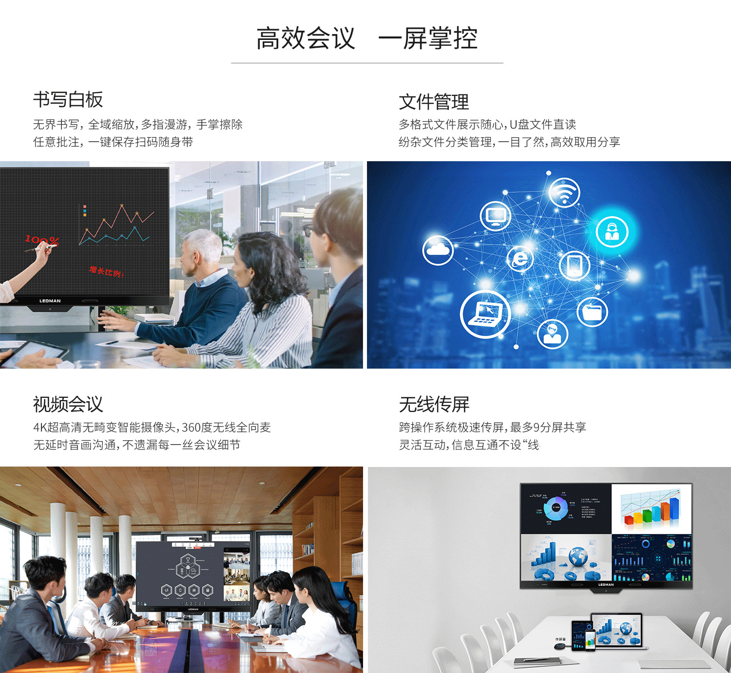 3. 无限投屏:支持PC、安卓、IOS等硬件传屏、9分屏显示;