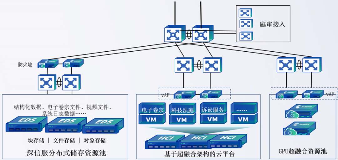深信服企业级分布式存储EDS,基于多年对分布式存储的研究和超融合实践经验进行了全新分布式统一存储设计和实现,同时支持块、文件以及对象存储,既兼容传统存储的协议和接口,又面向智慧法院未来的业务特点和发展方向支持对象存储。
