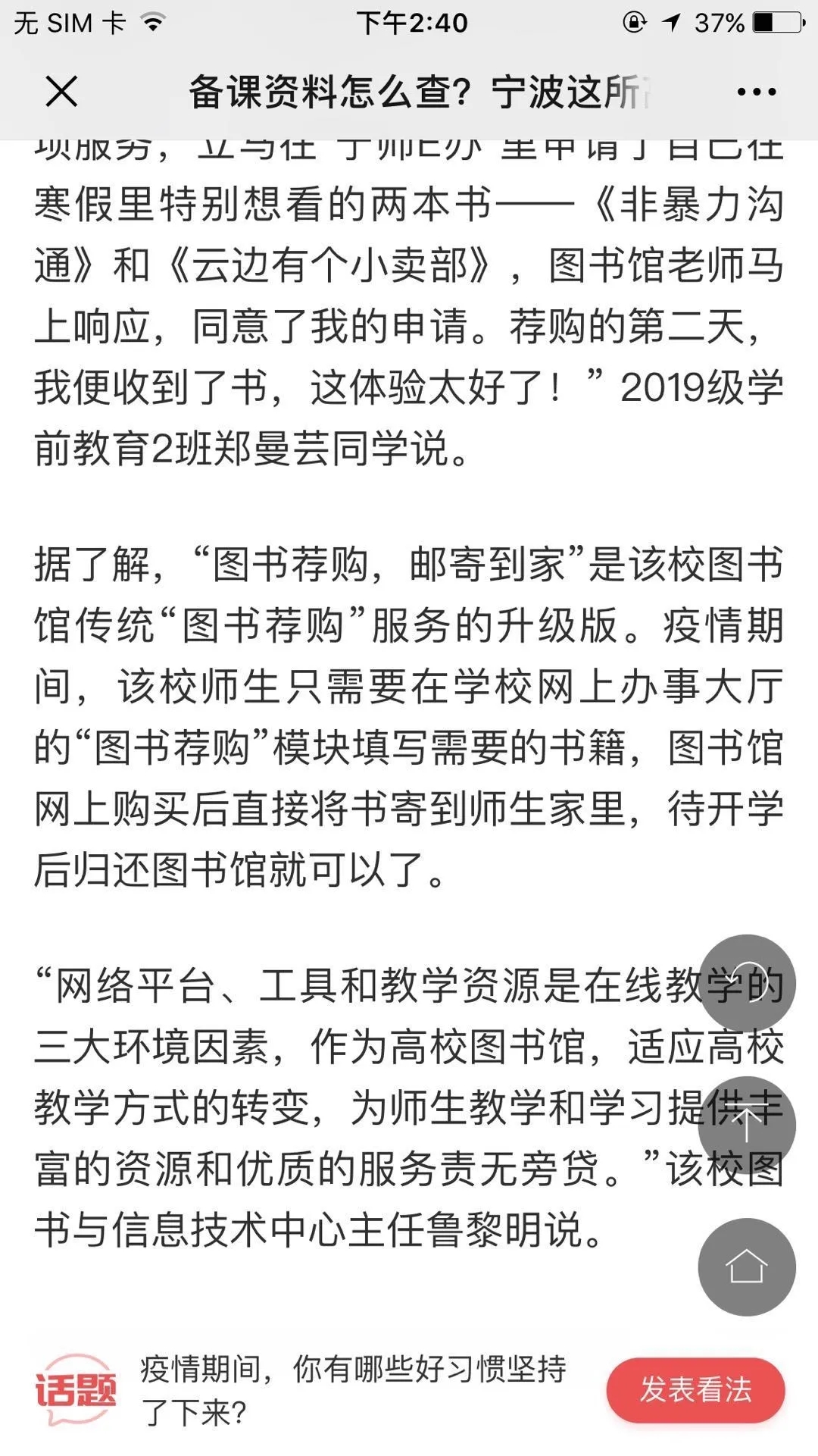 值得一提的是,疫情期间校方图书线上借阅服务被宁波晚报、人民日报等媒体报道。