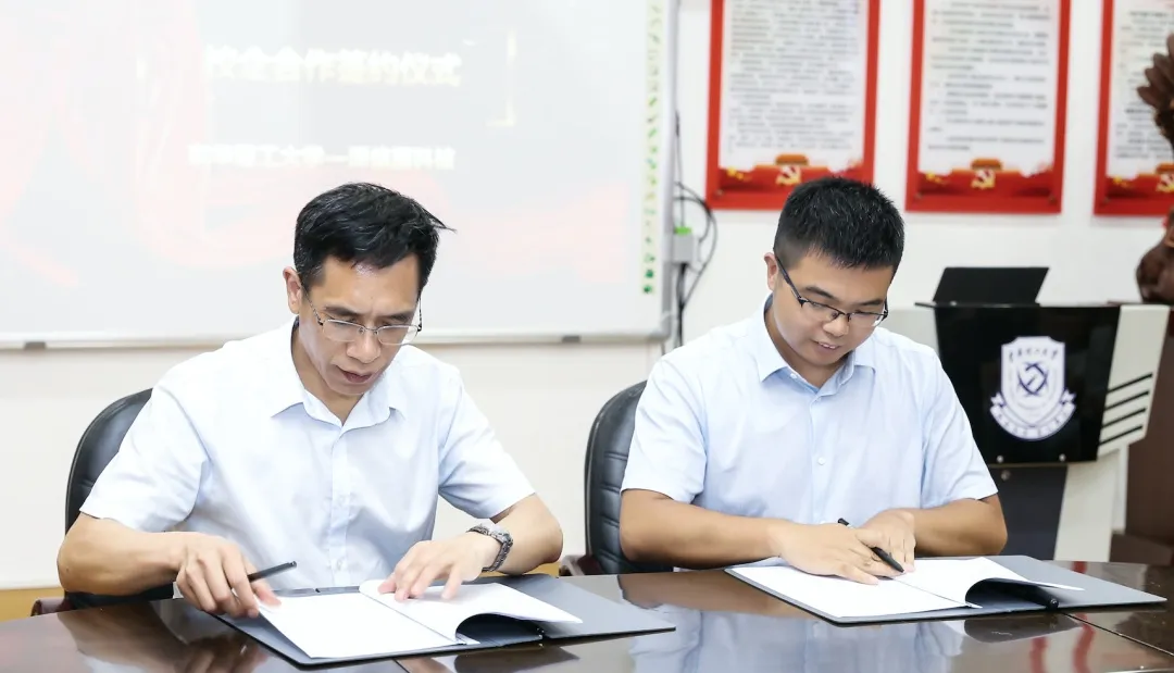 ▲东华理工大学信息工程学院、软件学院院长何月顺与深信服教育事业部总经理尘鹤代表双方签署协议
