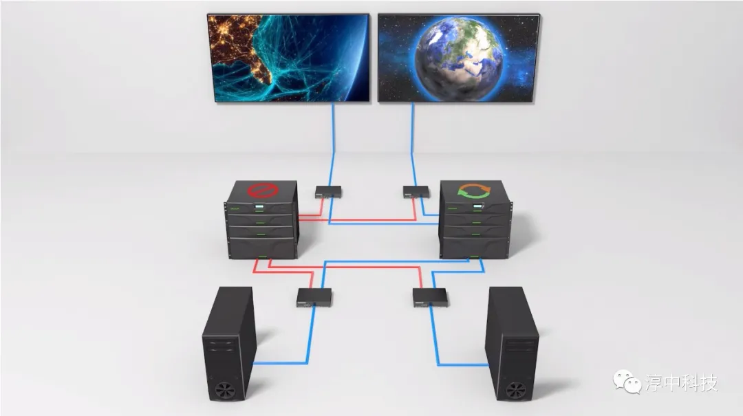 KVM坐席系统解决了指挥中心信息安全、各席位工作孤立的问题,同时大大简化了用户的业务流程,提高了用户的业务效率。坐席系统对稳定性的要求非常严格,而冗余备份系统恰恰为其提供了完美的解决方案。相较于音视频系统,坐席系统的备份更为复杂,不仅仅是简单的音视频切换备份,同时还包括USB数据、键鼠等控制信号的备份处理。