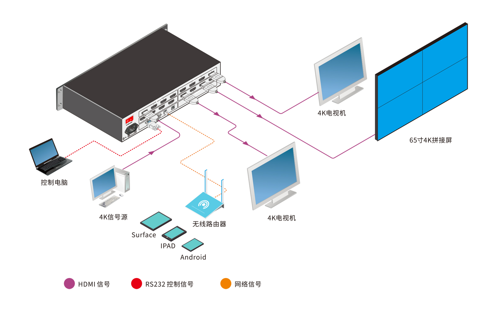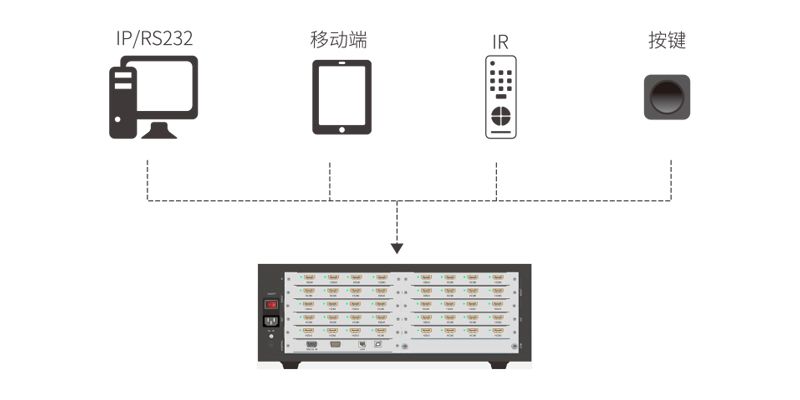 TCP/UDP网络控制,RS232控制,红外遥控,按键,,STC和MTC,外置键盘等控制方式,并可实现外围设备的接入与控制。